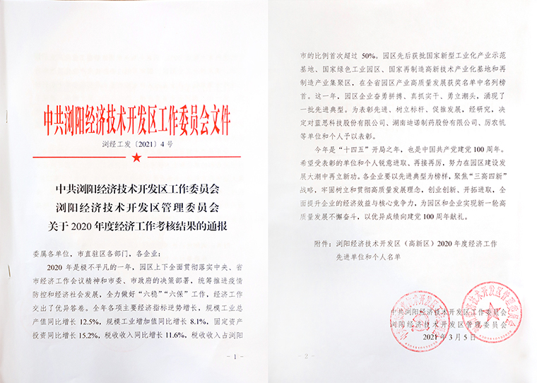 中共瀏陽市委副書記、市委黨校校長王強宣讀經開區(qū)(高新區(qū))2020年度經濟工作考核結果文件。大會對2020年度先進企業(yè)及個人予以集中表彰。綠之韻集團憑借過去一年取得的突出成績,被國家級瀏陽經開區(qū)(高新區(qū))管委會授予2020年度“智能發(fā)展獎”。