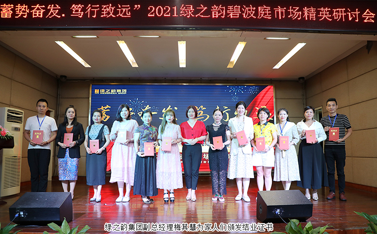 除了產(chǎn)品課程分享之外,各行業(yè)領(lǐng)域的大咖也帶來了精彩的專業(yè)知識(shí)培訓(xùn)。6月17日,大型紀(jì)錄片《曾國藩》導(dǎo)演、湖南電視臺(tái)制片人曾海波作《聽過曾國藩,從此不平凡》主題演講。同時(shí),店鋪管理及業(yè)務(wù)流程、市場(chǎng)案例分析等專業(yè)課程的分享,都讓在座的綠之韻家人們收獲頗豐。培訓(xùn)臨近結(jié)束,綠之韻集團(tuán)副總經(jīng)理梅其慧作總結(jié)發(fā)言并頒發(fā)結(jié)業(yè)證書。她表示,此次研討會(huì)精心安排內(nèi)容豐富的培訓(xùn)課程,是希望大家能學(xué)有所感、學(xué)有所悟、學(xué)有所用,通過系統(tǒng)學(xué)習(xí),把今天“學(xué)”到的內(nèi)容“習(xí)”到明天的市場(chǎng)活動(dòng)當(dāng)中。未來集團(tuán)公司和碧波庭也一定會(huì)繼續(xù)給予各位市場(chǎng)伙伴全方位的支持與幫助,全力為大家打造更優(yōu)質(zhì)的事業(yè)平臺(tái),同心同德同行,為實(shí)現(xiàn)偉大的綠之韻碧波庭健康事業(yè)而努力奮斗。她相信,在大家的不懈努力下,綠之韻碧波庭的未來一定美好可期 。