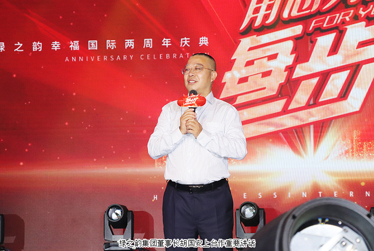 會議最后,在現(xiàn)場最為熱烈的掌聲中,綠之韻集團董事長胡國安上臺講話。他首先向大會現(xiàn)場以及通過在線互動視頻觀看本次周年慶典的綠之韻家人致以熱烈的歡迎和誠摯的問候,并向每一位獲獎?wù)弑硎緹崃业淖YR。他說道,我是綠之韻代言人胡國安,也是你們的幸福代言人。今年的7月1日,我們即將迎來偉大的中國共產(chǎn)黨100周年誕辰。百年來,因為延安精神、井岡山精神、抗疫精神、抗震精神等一系列優(yōu)秀的傳承精神為中國共產(chǎn)黨的繁榮、發(fā)展和壯大注入了源源不斷的新動能。在綠之韻幸福國際兩周年之際,我十分欣慰,看到如此多優(yōu)秀的幸福代言人獲得了屬于自己的榮譽,看到臺前幕后許許多多幸福國際領(lǐng)導(dǎo)人忙碌的身影,從你們身上看到了那種優(yōu)秀的精神,我為你們點贊!未來,在綠之韻事業(yè)的發(fā)展路上,在幸福國際的路上,在奔向幸福的道路上,有你,有我,有我們。我相信,各位幸福代言人將在綠之韻集團執(zhí)行總經(jīng)理夏運良的領(lǐng)導(dǎo)下取得更大的突破。我更欣慰的看到你們在市場發(fā)展的過程中,始終堅持“以產(chǎn)品為導(dǎo)向”發(fā)展理念,致力于傳承中華五千年養(yǎng)生文化,堅持走中國的大健康之路,堅持把支部扎根在連隊上,培養(yǎng)各類優(yōu)秀骨干。真心的祝愿現(xiàn)場的每一位幸福代言人,希望你們在未來綠之韻幸福國際的3周年、5周年乃至10周年的頒獎盛典上,都能成為家族的驕傲、同事學(xué)習(xí)的榜樣,公司的骨干,國家的棟梁。讓我們一起奔跑在幸福的道路上。