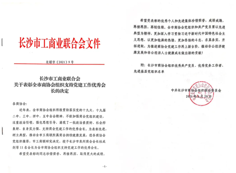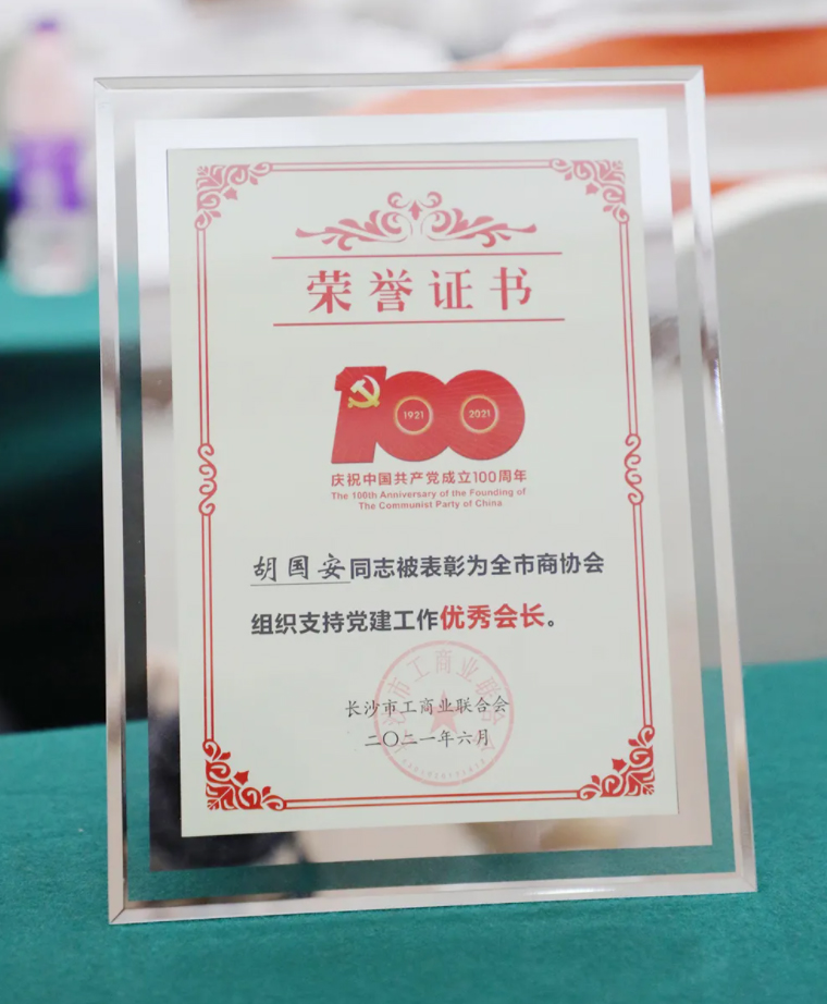 隨后,現(xiàn)場(chǎng)舉行了盛大的頒獎(jiǎng)儀式。對(duì)長沙市商協(xié)會(huì)組織優(yōu)秀共產(chǎn)黨員、優(yōu)秀黨務(wù)工作者、先進(jìn)基層黨組織和支持黨建工作優(yōu)秀會(huì)長進(jìn)行了表彰。長沙市安化商會(huì)會(huì)長、綠之韻集團(tuán)董事長胡國安被長沙市工商業(yè)聯(lián)合會(huì)授予“全市商協(xié)會(huì)組織支持黨建工作優(yōu)秀會(huì)長”榮譽(yù)稱號(hào);中共長沙市安化商會(huì)黨支部被授予“先進(jìn)基層黨組織”。