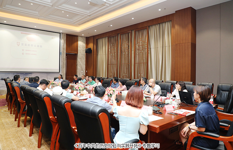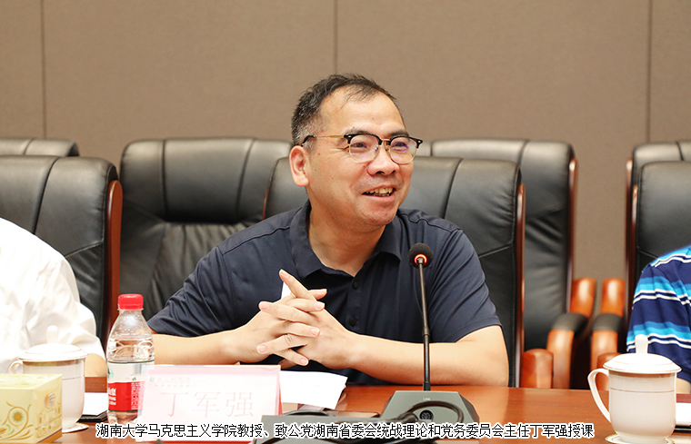 調(diào)研期間,湖南大學(xué)馬克思主義學(xué)院教授、致公黨湖南省委會(huì)統(tǒng)戰(zhàn)理論和黨務(wù)委員會(huì)主任丁軍強(qiáng)教授以《百年中共的歷史經(jīng)驗(yàn)與實(shí)踐開(kāi)拓》為題現(xiàn)場(chǎng)授課,分別從“百年中共的歷史進(jìn)程與歷史經(jīng)驗(yàn)”、“面向未來(lái)的理論創(chuàng)新與開(kāi)拓創(chuàng)新”、“知史閱世的重大意義與學(xué)思悟踐”三個(gè)方面深層次解讀中國(guó)共產(chǎn)黨波瀾壯闊的百年黨史,并結(jié)合習(xí)近平總書(shū)記在慶祝中國(guó)共產(chǎn)黨成立100周年大會(huì)上的重要講話深入分析,深刻詮釋了中國(guó)共產(chǎn)黨為什么“能”、馬克思主義為什么“行”、中國(guó)特色社會(huì)主義為什么“好”,進(jìn)一步領(lǐng)會(huì)中國(guó)共產(chǎn)黨先進(jìn)的政治屬性、崇高的政治理想、高尚的政治追求、純潔的政治品質(zhì)。