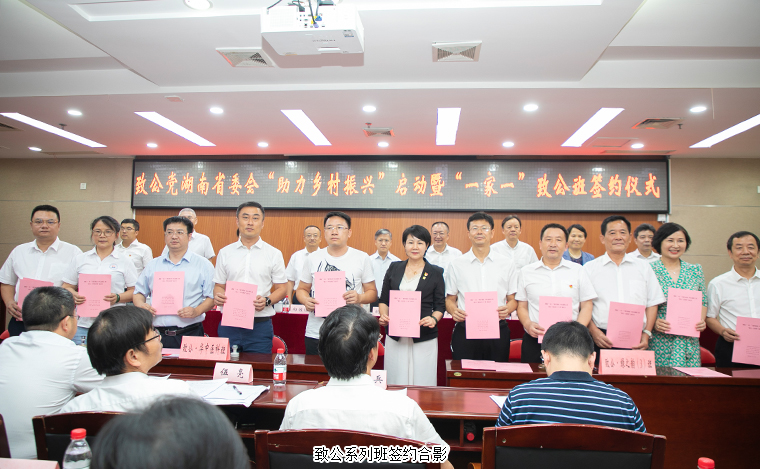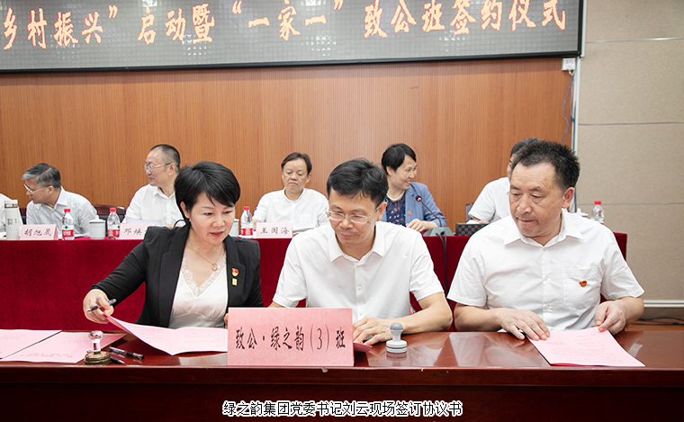 2021年7月26日,致公黨湖南省委會“助力鄉(xiāng)村振興”啟動暨“一家一”致公班簽約儀式在長沙舉行。湖南省政協(xié)副主席、致公黨湖南省委會主委胡旭晟;中共湖南省委統(tǒng)戰(zhàn)部副部長鄧煥生;致公黨湖南省委會專職副主委向佐誼,省委會副主委、長沙市人大副主任王國海,省委會副主委、省體育局局長羅雙全,省委會副主委、湖南師范大學(xué)副校長謝資清,省委會副主委劉丹軍,省委會秘書長、二級巡視員田宗之;中共安化縣委副書記、安化縣人民政府縣長肖義等領(lǐng)導(dǎo)出席。綠之韻集團黨委書記劉云參加會議。