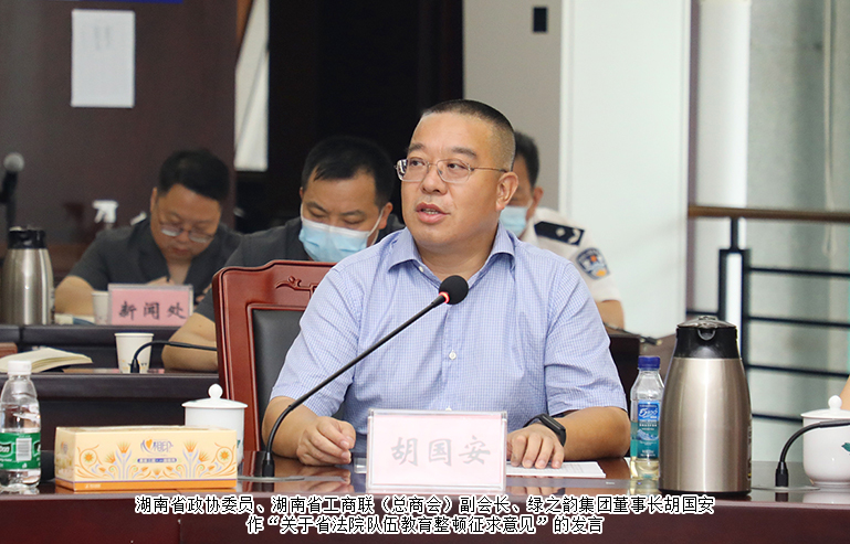 2021年8月24日,為廣泛聽取社會各界對法院工作和法院隊伍的意見建議,切實提升省法院隊伍教育整頓工作成效,湖南省高級人民法院隊伍教育整頓座談會在長沙召開。湖南省高級人民法院黨組書記、院長田立文,黨組副書記、副院長鄔文生,省紀(jì)委省監(jiān)委駐省法院紀(jì)檢監(jiān)察組組長、省法院黨組成員粟志遠(yuǎn),黨組成員、政治部主任董嵐等領(lǐng)導(dǎo)出席會議。湖南省政協(xié)委員、湖南省工商聯(lián)(總商會)副會長、綠之韻集團(tuán)董事長胡國安受邀參加會議。