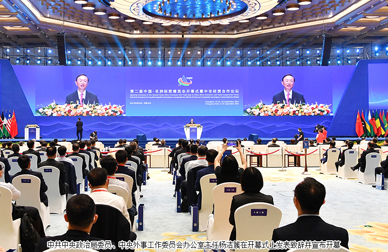 2021年9月26日,第二屆中國(guó)-非洲經(jīng)貿(mào)博覽會(huì)暨中非經(jīng)貿(mào)合作論壇在長(zhǎng)沙隆重開(kāi)幕。開(kāi)幕式上,中共中央政治局委員、中央外事工作委員會(huì)辦公室主任楊潔篪致辭并宣布開(kāi)幕。楊潔篪在致辭中說(shuō),中國(guó)和非洲是命運(yùn)與共、志同道合的好朋友、好伙伴、好兄弟。習(xí)近平主席親自提出真實(shí)親誠(chéng)對(duì)非政策理念和正確義利觀,親自推動(dòng)構(gòu)建更加緊密的中非命運(yùn)共同體,中非政治互信日益牢固,貿(mào)易投資、基礎(chǔ)設(shè)施、新興產(chǎn)業(yè)等領(lǐng)域務(wù)實(shí)合作碩果累累。