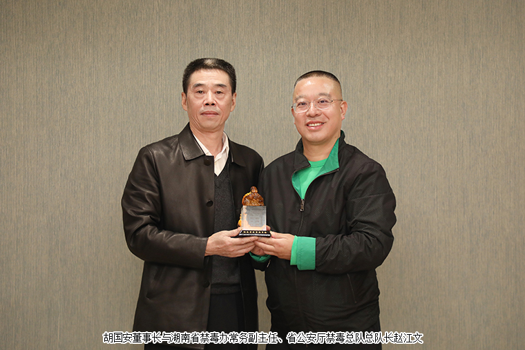 2021年10月28日,湖南省禁毒辦常務(wù)副主任、省公安廳禁毒總隊總隊長趙江文,省禁毒協(xié)會會長董瑛,省禁毒辦副主任、省公安廳禁毒總隊副總隊長李鵬飛,省公安廳禁毒總隊預(yù)防教育支隊支隊長彭國清等一行蒞臨綠之韻集團進行禁毒工作交流并舉行“湖南省禁毒協(xié)會副會長單位”授牌儀式。綠之韻集團董事長胡國安,綠之韻公益基金會理事長、綠之韻集團董事總裁勞嘉,綠之韻公益基金會秘書長蔣文參與本次工作交流會。