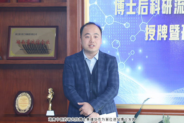 黃建華作為首位進(jìn)站博士在會上發(fā)言。他表示,將繼續(xù)做好專業(yè)工作的排頭兵,勇于創(chuàng)新,勤于實踐。一是堅持好基礎(chǔ)研究;二是與企業(yè)需求相結(jié)合,與公司的科研人員一道攻堅克難,完善知識儲備、促進(jìn)交流合作和成果轉(zhuǎn)化;三是做好銜接工作,作為學(xué)校和企業(yè)之間的橋梁,共同建設(shè)好科研協(xié)作中心平臺,力爭取得更好的科研成果。湖南中醫(yī)藥大學(xué)研究生院院長喻嶸表示,非常感謝綠之韻集團(tuán)一直支持科學(xué)研究工作,希望雙方借此契機更好的實現(xiàn)科研資源共享、校企合作以及高端人才培養(yǎng),使博士后管理工作高效、高質(zhì)量、可持續(xù)發(fā)展。