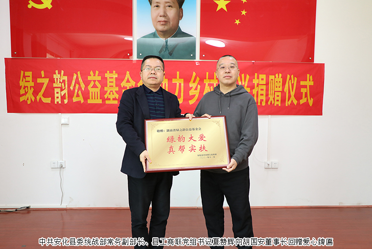 捐贈儀式由安化縣人民政府黨組成員、副縣長陽鋒主持?;顒右潦迹泄舶不h冷市鎮(zhèn)黨委書記方平致辭。他首先向致公黨湖南省委會互聯(lián)網(wǎng)+專委會,綠之韻集團等愛心企業(yè)的到來表示熱烈地歡迎。向長期以來關(guān)心、支持和幫助安化實施鄉(xiāng)村振興戰(zhàn)略的致公黨湖南省委會及社會各界人士表示衷心感謝。隨后,湖南省政協(xié)委員、致公黨湖南省委會互聯(lián)網(wǎng)+專委會名譽主任、綠之韻集團董事長胡國安代表綠之韻公益基金會向胡家村村委捐贈108萬元愛心支票,安化縣委統(tǒng)戰(zhàn)部常務(wù)副部長、縣工商聯(lián)黨組書記夏贊輝,胡家村村支部書記胡利民分別向綠之韻集團、致公黨互聯(lián)網(wǎng)+專委會回贈愛心牌匾。
