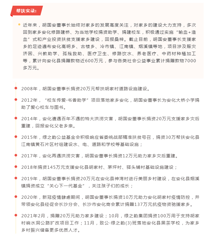 在與致公黨湖南省委會互聯(lián)網(wǎng)+專委會深入安化胡家村開展鄉(xiāng)村振興專項調(diào)研的過程中,胡國安董事長表示,胡家村要實現(xiàn)從脫貧攻堅到鄉(xiāng)村振興的轉(zhuǎn)換,必須因地制宜,因地制策,做好相關(guān)規(guī)劃,其中,產(chǎn)業(yè)振興是胡家村鄉(xiāng)村振興最基礎(chǔ)的要求,也是最基本的保障。只有從根本上構(gòu)建起可持續(xù)的產(chǎn)業(yè)發(fā)展長效機制,才能夠持續(xù)鞏固脫貧攻堅發(fā)展成果,切實加強防止返貧。未來,綠之韻公益基金會將攜手更多愛心企業(yè),社會組織等積極參與到胡家村鄉(xiāng)村振興的具體規(guī)劃中,助力家鄉(xiāng)建設(shè)。一是美麗村組建設(shè),即村容村貌建設(shè)以及對疫情災(zāi)情幫扶和困難家庭幫扶;二是特色產(chǎn)業(yè)幫扶,繼續(xù)加大以茶產(chǎn)業(yè)和黃精種植為主體的中藥材產(chǎn)業(yè),增強人才、技術(shù)和資金投入,強化企業(yè)化市場運作體系,讓村民真正得到實惠。今后,他將繼續(xù)引領(lǐng)企業(yè),履行社會責(zé)任,高度關(guān)注和支持家鄉(xiāng)安化建設(shè)和發(fā)展,用實實在在的行動帶動更多的愛心人士和企業(yè)參與到“鄉(xiāng)村振興”和“助力共同富裕”中來,使家鄉(xiāng)人民得實惠、普受惠、常受惠,為現(xiàn)代化新安化貢獻力量。