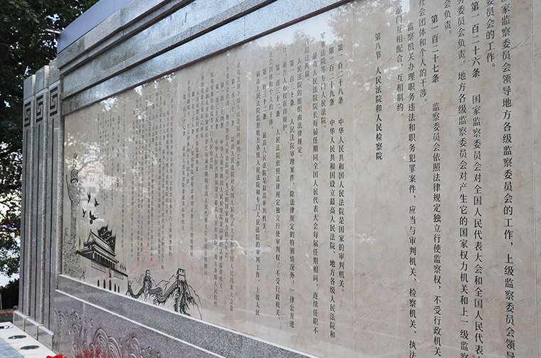 據(jù)了解,市人大機關(guān)憲法墻雕刻內(nèi)容為《中華人民共和國憲法》,從右至左、由上而下刻下了憲法全文,包括序言、四章、143條。整個憲法墻由八塊大理石墻面和20根方柱組成,總長約70米,總面積約700平方米,有效體現(xiàn)了憲法作為國家根本大法的莊重與威嚴,全面展現(xiàn)了憲法作為國家的根本法和治國安邦的總章程,在推動和保障中國特色社會主義建設(shè)中的巨大作用。憲法墻的建立,旨在深入學習貫徹落實習近平法治思想、弘揚憲法精神、助力憲法和法律的實施。與此同時,憲法墻與機關(guān)黨建墻、長沙人大歷史陳列室、基層立法聯(lián)系點一道,成為了市人大法治宣傳陣地的重要組成部分。