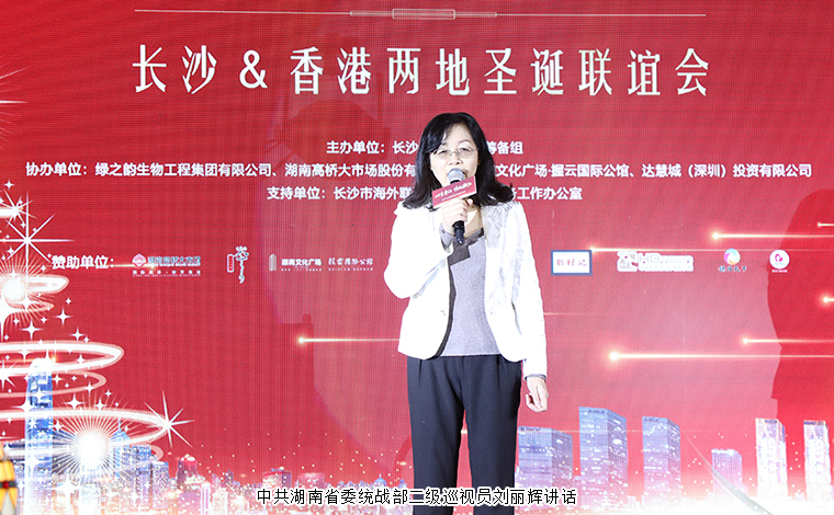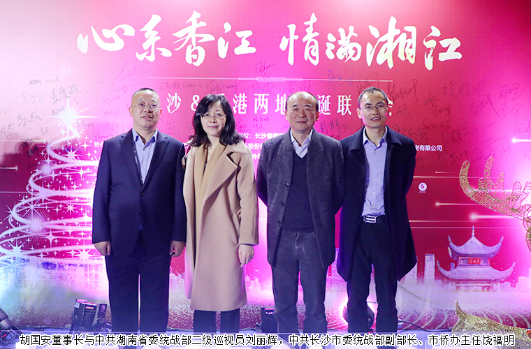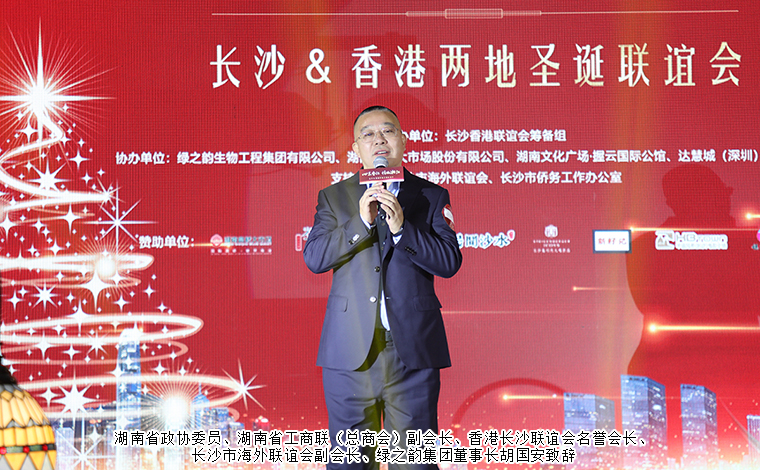 2021年12月25日,由長沙香港聯(lián)誼會籌備組主辦的“心系香江 情滿湘江”長沙&香港兩地圣誕聯(lián)誼會在長沙舉行。中共湖南省委統(tǒng)戰(zhàn)部二級巡視員劉麗輝、港澳臺處副處長曾海峰;湖南省港澳辦港澳處處長黎沖、三級主任科員李文明;湖南省委宣傳部對外推廣處副處長王文彬;中共長沙市委統(tǒng)戰(zhàn)部副部長、市僑辦主任饒福明,市委統(tǒng)戰(zhàn)部港澳臺處四級調研員李燁、港澳臺處處長趙敏,港澳臺處二級主任科員王華銘;長沙市港澳辦港澳處處長吳沙等領導參加活動。湖南省政協(xié)委員、湖南省工商聯(lián)(總商會)副會長、香港長沙聯(lián)誼會名譽會長、長沙市海外聯(lián)誼會副會長、綠之韻集團董事長胡國安受邀參加活動。