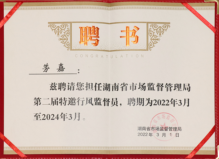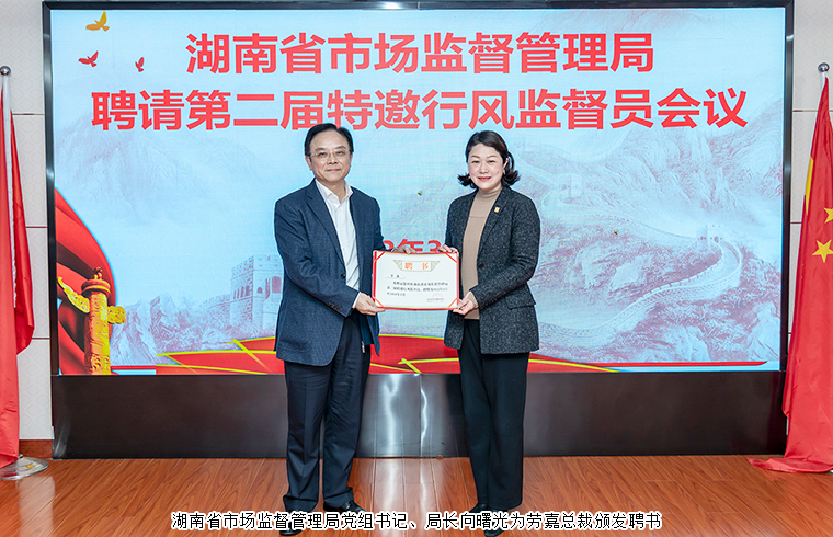 湖南省市場監(jiān)督管理局黨組成員、省藥監(jiān)局黨組書記梁毅恒宣讀了《關于省局干部隊伍作風紀律教育整頓總體情況的通報》。湖南省市場監(jiān)督管理局副局長李沐宣讀聘請?zhí)匮酗L監(jiān)督員的通知。勞嘉總裁受聘為湖南省市場監(jiān)督管理局第二屆特邀行風監(jiān)督員。