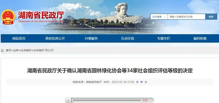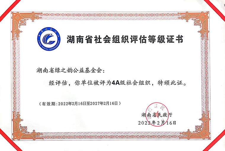 2022年3月9日,湖南省社會組織等級評估授牌大會在長沙召開。根據(jù)民政部《社會組織評估管理辦法》、《湖南省社會組織評估管理辦法》有關(guān)規(guī)定,社會組織等級評估從基礎(chǔ)條件、內(nèi)部治理、工作績效、黨建工作和社會評價五個方面對申報單位進行綜合考評,經(jīng)專家組實地考察、現(xiàn)場交流、意見反饋、資料核查、網(wǎng)上公示等程序,最終確定評估等級。湖南省綠之韻公益基金會獲評“4A級社會組織”。