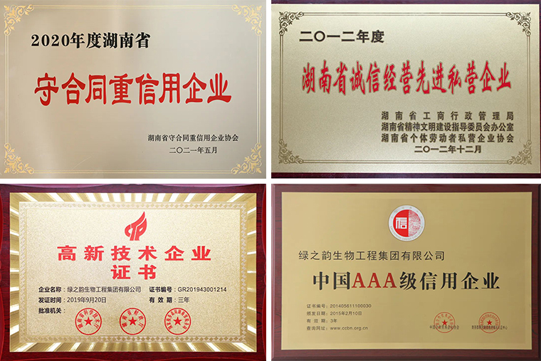 “和誠立信,競超興業(yè)”是綠之韻集團秉承的經(jīng)營宗旨和行動準則。十九年來,綠之韻集團在胡國安董事長的引領下,堅持以規(guī)范為根本、以責任為使命、以品質(zhì)為生命,立足健康可持續(xù)發(fā)展,維護消費者合法權益,傳遞行業(yè)正能量,不僅在企業(yè)品牌、戰(zhàn)略、管理、文化等方面實現(xiàn)了大幅度提升,而且還不遺余力地為行業(yè)培養(yǎng)了許多行業(yè)精英人才,為民族品牌的良性發(fā)展與崛起貢獻了自己的力量。綠之韻連續(xù)十多年被授予“湖南省守合同重信用單位”,連續(xù)多年被授予納稅信用A級榮譽,先后獲評“國家高新技術企業(yè)”“中國企業(yè)誠信經(jīng)營示范單位”“中國AAA級信用企業(yè)”“湖南省誠信經(jīng)營先進私營企業(yè)”“湖南省著名商標”“湖南名牌”等多項殊榮。胡國安董事長個人先后被授予“全國優(yōu)秀中國特色社會主義事業(yè)建設者、全國先進愛國企業(yè)家、全國優(yōu)秀民營企業(yè)家、共青團中央“第四屆中國青年創(chuàng)業(yè)獎”、共青團中央“希望工程25周年杰出貢獻獎”、中華慈善總會“中華慈善突出貢獻獎”、湖南省“五一”勞動獎章、湖南省“百名最美扶貧人物”、CCTV感動中國(湖南)十佳人物、湖南省人民政府頒發(fā)的一等功、長沙市人民政府頒發(fā)的二等功等國家、省市各級各類榮譽200多項。