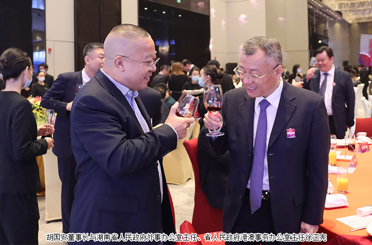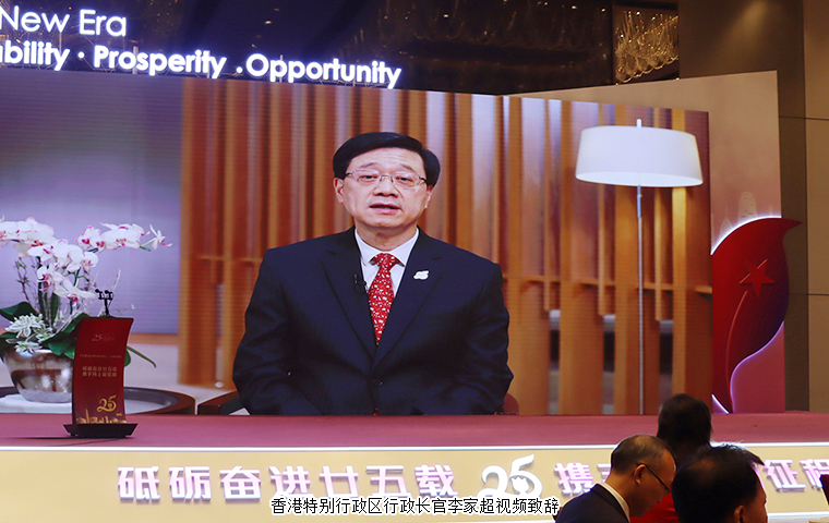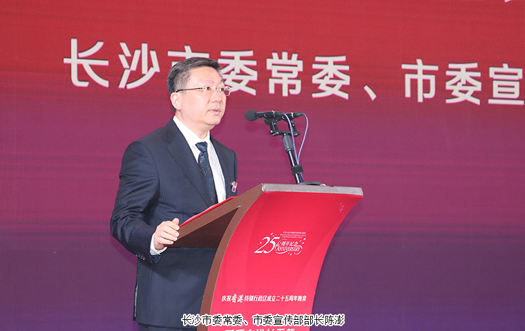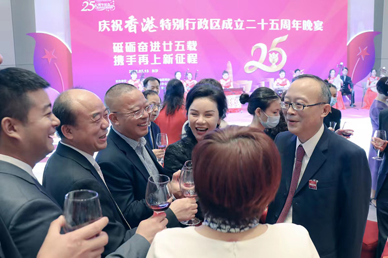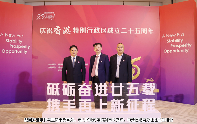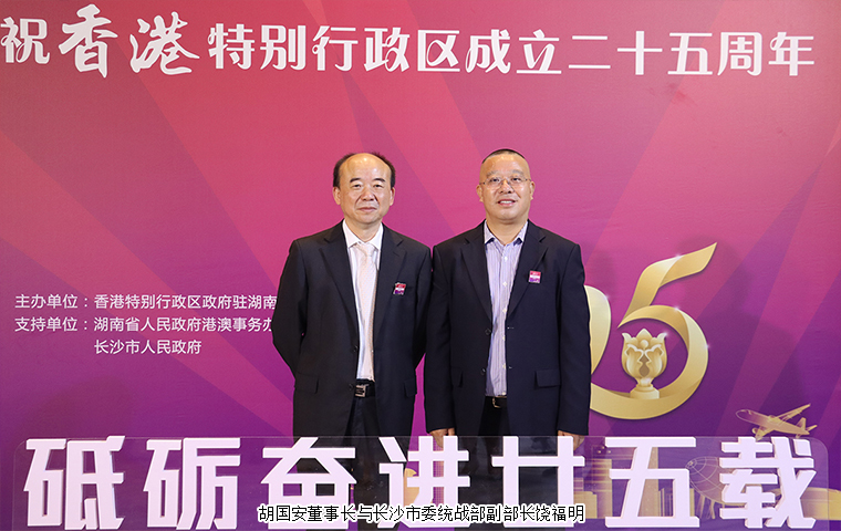 為慶祝香港特別行政區(qū)成立25周年,共同見(jiàn)證“一國(guó)兩制”實(shí)踐偉大成就,并展望湖南與香港合作新前景,香港特區(qū)政府駐湖南聯(lián)絡(luò)處、湖南省政府港澳辦、長(zhǎng)沙市政府于7月13日在長(zhǎng)沙舉辦香港特別行政區(qū)成立25周年慶祝晚宴。香港特別行政區(qū)行政長(zhǎng)官李家超視頻致辭。湖南省委常委、省人民政府常務(wù)副省長(zhǎng)李殿勛,香港特別行政區(qū)政府駐武漢經(jīng)濟(jì)貿(mào)易辦事處主任郭偉勛,湖南省人民政府外事辦公室主任、省人民政府港澳事務(wù)辦公室主任徐正憲,湖南省委統(tǒng)戰(zhàn)部副部長(zhǎng)、省社會(huì)主義學(xué)院黨組書(shū)記丁學(xué)新,長(zhǎng)沙市委常委、市委宣傳部部長(zhǎng)陳澎,香港特別行政區(qū)政府駐湖南聯(lián)絡(luò)處主任廖鳳嫻等領(lǐng)導(dǎo)出席活動(dòng)。湖南省政協(xié)委員,香港長(zhǎng)沙聯(lián)誼會(huì)會(huì)長(zhǎng),香港長(zhǎng)沙商會(huì)常務(wù)副會(huì)長(zhǎng),綠之韻集團(tuán)董事長(zhǎng)胡國(guó)安受邀參加活動(dòng)。