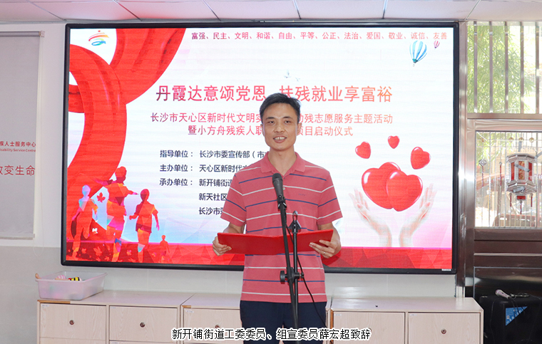活動(dòng)伊始,新開鋪街道工委委員、組宣委員薛宏超致辭。他首先代表街道黨工委辦事處向關(guān)心支持幫助殘疾人朋友群體的各位領(lǐng)導(dǎo),各位嘉賓表示衷心的感謝。就業(yè)是殘疾人實(shí)現(xiàn)自身價(jià)值融入社會(huì),從根本上改善生活狀況的重要途徑,是落實(shí)民生為本的基本舉措,也是當(dāng)前社會(huì)文明進(jìn)步的重要標(biāo)志。一直以來,街道高度重視殘疾人職業(yè)發(fā)展規(guī)劃,注重解決殘疾人就業(yè)問題。通過引進(jìn)社會(huì)組織服務(wù)機(jī)構(gòu),挖掘公益性崗位,為殘疾人申請(qǐng)創(chuàng)業(yè)扶持補(bǔ)貼,為困難個(gè)體工商戶發(fā)放就業(yè)救助金等形式,為殘疾人士就業(yè)提供堅(jiān)實(shí)保障。