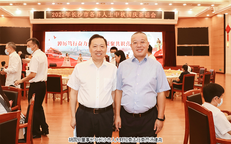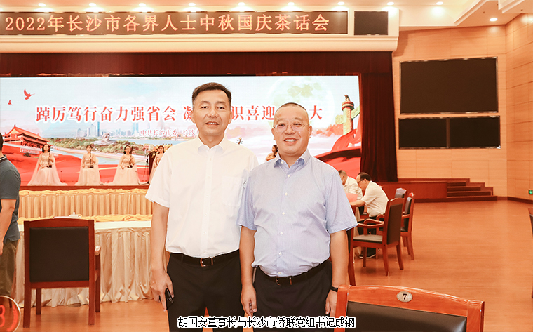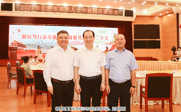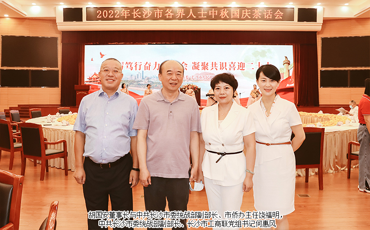 2022年9月9日,由中共長(zhǎng)沙市委、長(zhǎng)沙市政府主辦的2022年長(zhǎng)沙市各界人士中秋國(guó)慶茶話會(huì)在長(zhǎng)沙舉行。中共湖南省委常委、長(zhǎng)沙市委書記吳桂英,市委副書記、湖南湘江新區(qū)黨工委書記、岳麓區(qū)委書記譚勇,市政協(xié)黨組書記、主席陳剛,市委常委、市紀(jì)律檢查委員會(huì)書記、市監(jiān)察委員會(huì)主任胡衛(wèi)兵,市委常委、長(zhǎng)沙警備區(qū)政治委員馮紫英,市委常委、市委秘書長(zhǎng)劉擁兵,市委常委、統(tǒng)戰(zhàn)部長(zhǎng)、市政協(xié)黨組副書記劉匯等領(lǐng)導(dǎo)出席活動(dòng)。長(zhǎng)沙市人大代表、湖南省長(zhǎng)沙市光彩事業(yè)基金會(huì)理事長(zhǎng)、香港長(zhǎng)沙聯(lián)誼會(huì)名譽(yù)會(huì)長(zhǎng)、綠之韻集團(tuán)董事長(zhǎng)胡國(guó)安與全市離退休老同志、各界人士代表歡聚一堂,飲一杯清茶,道一聲祝福,話一方發(fā)展。
