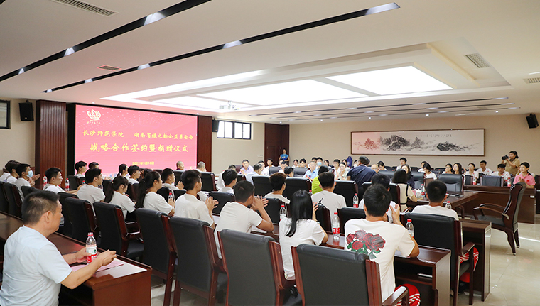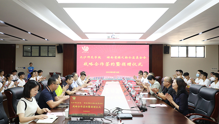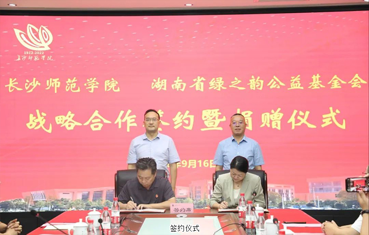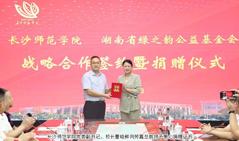 為進(jìn)一步推進(jìn)幼體融合、助力學(xué)前教育高質(zhì)量發(fā)展,2022年9月16日,長沙師范學(xué)院與湖南省綠之韻公益基金會戰(zhàn)略合作簽約暨捐贈儀式在長沙師范學(xué)院舉行。湖南省政協(xié)委員胡國安通過綠之韻公益基金會捐資40萬元與長沙師范學(xué)院共建湖南省幼兒體質(zhì)健康促進(jìn)研究院。長沙師范學(xué)院黨委副書記、校長曹曉鮮,黨委委員、副校長黃快林,黨委委員、副校長徐慶軍,奧運(yùn)冠軍、體育運(yùn)動委員會專職副主任龔智超,體育科學(xué)學(xué)院院長陳捷,創(chuàng)新創(chuàng)業(yè)學(xué)院院長張德啟,教務(wù)處副處長陳亮,校友會副秘書長李月;湖南省政協(xié)委員、長沙師范學(xué)院客座教授、綠之韻集團(tuán)董事長胡國安,湖南省女企業(yè)家協(xié)會常務(wù)副會長、綠之韻集團(tuán)董事總裁、湖南省綠之韻公益基金會理事長勞嘉,傲迪瑪汽車董事局主席、湖南省綠之韻公益基金會副會長胡武安,湖南馬良數(shù)碼科技股份有限公司董事長周益安,湖南湘體愛動教育科技有限公司董事長張亞球,湖南馬良數(shù)碼科技股份有限公司總經(jīng)理李祥龍參加活動。