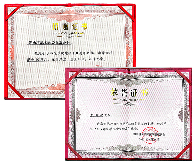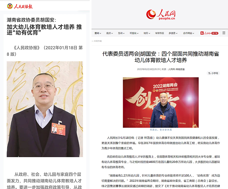 作為一名省政協(xié)委員,履職十多年來,胡國安董事長深入社區(qū)民情,積極參政議政,為湖南省經(jīng)濟(jì)發(fā)展獻(xiàn)計獻(xiàn)策,共提交了40份左右有價值的政協(xié)提案,涉及民創(chuàng)企業(yè)、青少年教育、扶危濟(jì)貧、健康養(yǎng)老、疾病預(yù)防、省市區(qū)發(fā)展等多個方面。2022年湖南省兩會期間,胡國安委員通過前期的調(diào)研,提交了《關(guān)于推動湖南省幼兒體育教培人才培養(yǎng)的建議》提案。針對湖南省幼兒園一般沒有專職體育教師、幼兒體育教培機(jī)構(gòu)的教師來源復(fù)雜、幼兒體育教培機(jī)構(gòu)中兼職教師的比例高等問題,他提出建議從政府、社會、幼兒園與家庭四個層面發(fā)力,共同推動湖南省幼兒體育教培人才培養(yǎng)。長沙師范學(xué)院體育學(xué)院高度重視該提案的社會效應(yīng),胡國安委員多次親自率領(lǐng)團(tuán)隊深入長沙師范學(xué)院就學(xué)前體育教師教育和幼兒體育事業(yè)發(fā)展進(jìn)行調(diào)研。為感謝胡國安董事長對長沙師范學(xué)院教育事業(yè)的支持,會上,長沙師范學(xué)院黨委副書記、校長曹曉鮮向胡國安董事長授予“長沙師范學(xué)院榮譽(yù)校友”證書。