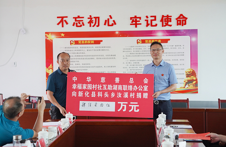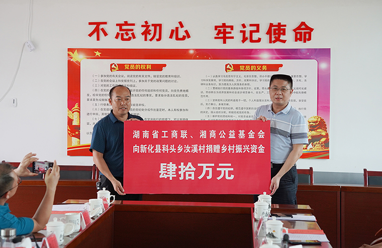 9月20日下午,在汝溪村召開了省工商聯(lián)對口幫扶新化縣鄉(xiāng)村振興座談會,了解新化縣貫徹全國、全省“萬企興萬村”行動推進會精神落實情況,聽取新化縣委、縣政府以及省工商聯(lián)駐縣工作組、駐汝溪工作隊的有關(guān)工作匯報?,F(xiàn)場進行了公益捐贈和項目簽約,湘商公益基金會、綠之韻集團分別為汝溪村捐贈鄉(xiāng)村振興幫扶資金40萬元、13.5萬元,中華慈善總會幸福家園村社互助湖南聯(lián)絡(luò)辦公室向科頭鄉(xiāng)捐贈了一批價值475萬元的醫(yī)療設(shè)備,懷化正好制藥有限公司與汝溪村的廣東紫珠項目進行現(xiàn)場簽約。