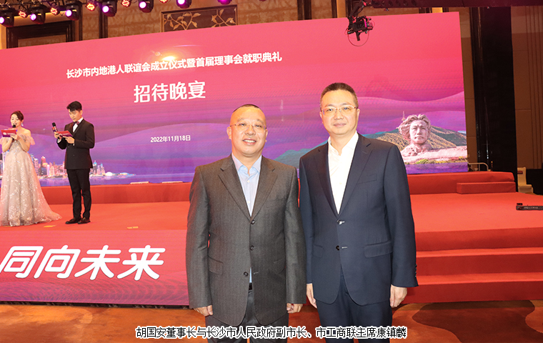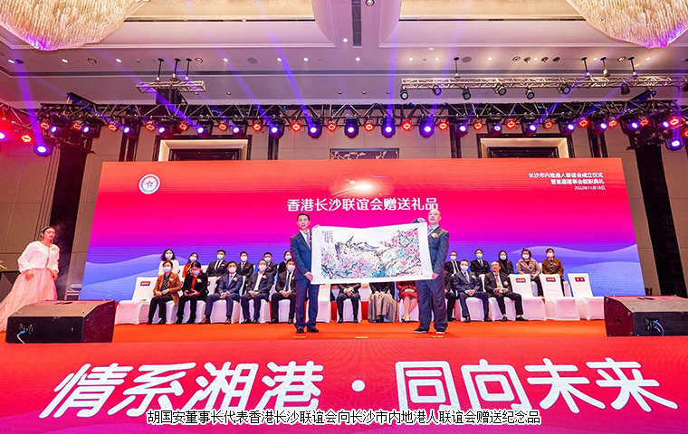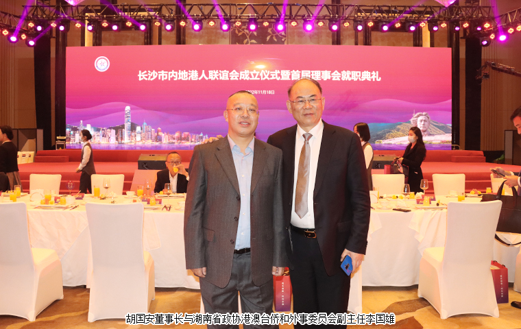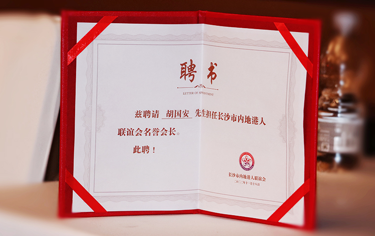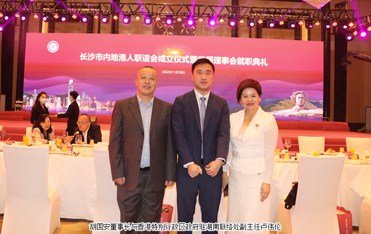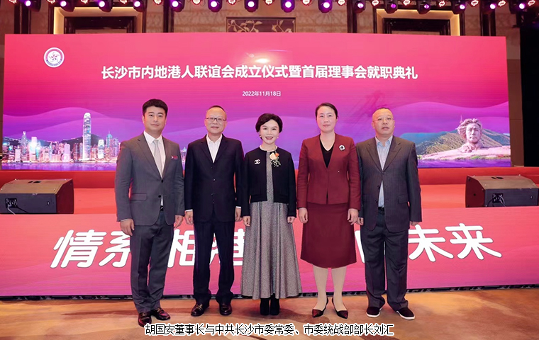 2022 年 11 月 18 日,長(zhǎng)沙市內(nèi)地港人聯(lián)誼會(huì)成立儀式暨首屆理事會(huì)就職典禮舉行。中共湖南省委統(tǒng)戰(zhàn)部副部長(zhǎng)、省社會(huì)主義學(xué)院黨組書(shū)記丁學(xué)新,湖南省政協(xié)港澳臺(tái)僑和外事委員會(huì)副主任李國(guó)雄,中共長(zhǎng)沙市委常委、市委統(tǒng)戰(zhàn)部部長(zhǎng)劉匯,長(zhǎng)沙市人民政府副市長(zhǎng)、市工商聯(lián)主席康鎮(zhèn)麟,長(zhǎng)沙市政協(xié)副主席、黨組成員劉金文,中共長(zhǎng)沙市雨花區(qū)委書(shū)記劉素月,香港特別行政區(qū)政府駐湖南聯(lián)絡(luò)處副主任盧偉倫等領(lǐng)導(dǎo)出席活動(dòng)。湖南省政協(xié)委員、湖南省慈善總會(huì)副會(huì)長(zhǎng)、香港長(zhǎng)沙聯(lián)誼會(huì)名譽(yù)會(huì)長(zhǎng)(代理會(huì)長(zhǎng))、香港長(zhǎng)沙商會(huì)常務(wù)副會(huì)長(zhǎng),長(zhǎng)沙市海外聯(lián)誼會(huì)常務(wù)副會(huì)長(zhǎng),綠之韻集團(tuán)董事長(zhǎng)胡國(guó)安先生受邀擔(dān)任活動(dòng)主禮嘉賓并受聘為長(zhǎng)沙市內(nèi)地港人聯(lián)誼會(huì)名譽(yù)會(huì)長(zhǎng)。