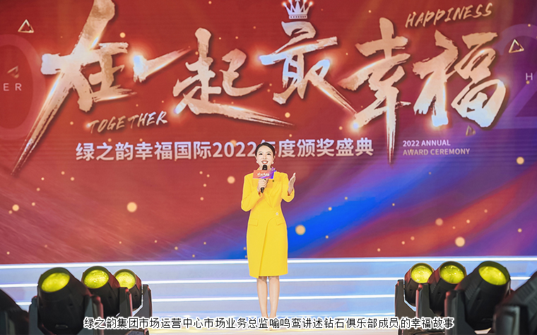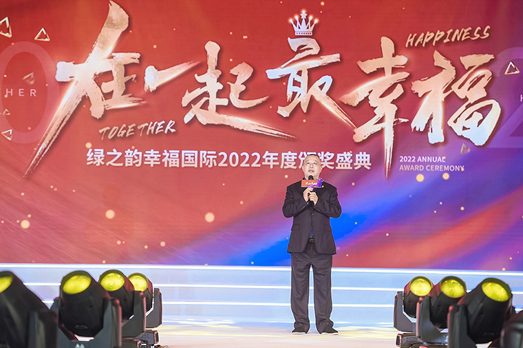 在全場(chǎng)熱烈的掌聲中,綠之韻集團(tuán)副總裁、幸福導(dǎo)師夏運(yùn)良作主題演講。他表示,不忘初心,三載前行,我們?cè)跔繏炫c堅(jiān)強(qiáng)中走過(guò)艱難的三年疫情,到此刻終于在熱血與希望中迎來(lái)相聚的幸福時(shí)刻,所有等待都值得,所有經(jīng)歷都讓我們倍加珍惜這來(lái)之不易的幸福。沒有一個(gè)冬天不會(huì)過(guò)去,也沒有一個(gè)春天不會(huì)到來(lái),希望所有的幸福代言人向陽(yáng)而生,逆風(fēng)而上。只要我們?cè)谝黄穑褪亲钚腋5氖?。三年?lái),幸福國(guó)際出發(fā)時(shí)正處于行業(yè)的寒冬期,失去“天時(shí)”;緊接著爆發(fā)的疫情,讓我們失掉“地利”;唯一能支撐我們走到今天的只有“人和”。感恩在我們通往幸福道路上不斷給予支持的胡國(guó)安董事長(zhǎng)、勞嘉總裁以及所有在背后為我們保駕護(hù)航的綠之韻同仁們;感恩每一位一起創(chuàng)造幸福的運(yùn)營(yíng)團(tuán)隊(duì),感恩每一位發(fā)展委委員、特聘市場(chǎng)講師、市場(chǎng)核心骨干以及每一位幸福代言人。正因?yàn)橛心銈?,才讓不確定的2022年變得不遺憾,也堅(jiān)信“人和”這兩個(gè)字將成為綠之韻幸福國(guó)際長(zhǎng)遠(yuǎn)發(fā)展的底氣。伴隨著打造品質(zhì)與品牌新三年的開啟,2023年,是綠之韻幸福國(guó)際生根、落地、結(jié)果的關(guān)鍵之年,我們要把產(chǎn)品做出效果,把服務(wù)做到極致,讓陪伴產(chǎn)生感覺,用同頻創(chuàng)造價(jià)值,締造未來(lái)更長(zhǎng)期的發(fā)展愿景。只要我們?cè)谝黄?,絕對(duì)專注的走好我們選擇的同一條路,相信每一步都有方向,每一步都有希望,每一步都有未來(lái)。期待2023年火力全開,再攀高峰,為綠之韻集團(tuán)成立二十周年獻(xiàn)禮!