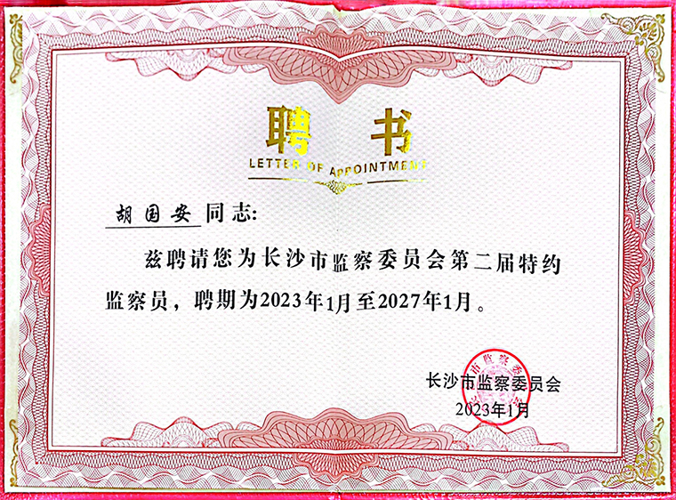 此次受聘為長沙市監(jiān)察委員會特約監(jiān)察員,胡國安董事長表示:特約監(jiān)察員既是一份榮譽,更是一項嚴(yán)肅的政治責(zé)任。我將積極發(fā)揮自身優(yōu)勢履行好監(jiān)督職責(zé),以強烈的責(zé)任感和使命感,聚焦紀(jì)委監(jiān)委中心工作,對紀(jì)檢監(jiān)察機關(guān)和干部秉公執(zhí)紀(jì)執(zhí)法、嚴(yán)格謹(jǐn)慎用權(quán)等方面進(jìn)行監(jiān)督,發(fā)揮好建言獻(xiàn)策、參謀咨詢、橋梁紐帶、宣傳引領(lǐng)作用,講政治、有奉獻(xiàn)、當(dāng)表率,積極當(dāng)好監(jiān)督員、參謀員和宣傳員,為推進(jìn)全市紀(jì)檢監(jiān)察工作高質(zhì)量發(fā)展作出積極貢獻(xiàn)。