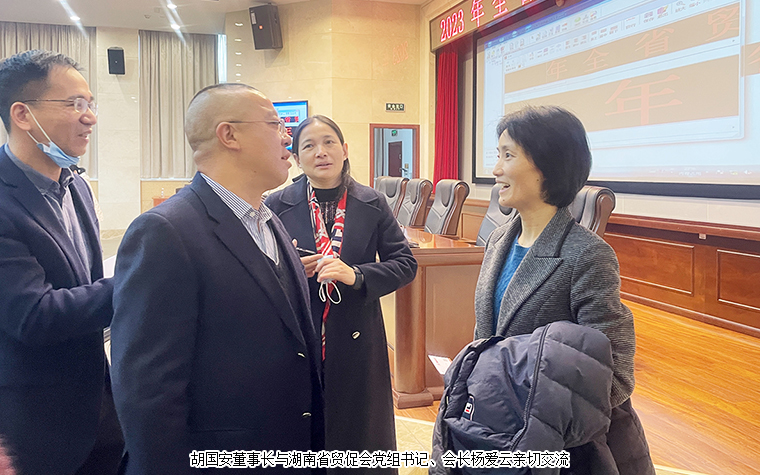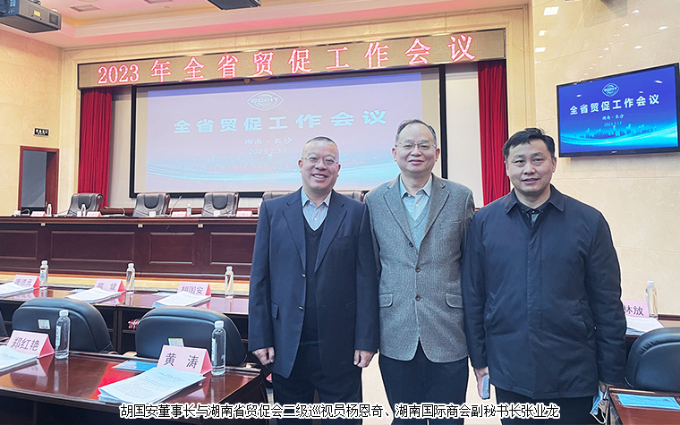 2023年2月17日,全省貿(mào)促工作會議在長沙召開。會議深入貫徹黨的二十大精神和習近平總書記對湖南重要講話重要指示批示精神,全面落實全國貿(mào)促工作會議、省委經(jīng)濟工作會議精神,總結2022年全省貿(mào)促工作,分析研判當前形勢,安排部署2023年工作。湖南省貿(mào)促會黨組書記、會長楊愛云作工作報告。黨組副書記、副會長吳曙光主持會議。伍登國、傅丹舟、鄧羅興、胡強等會領導出席會議。省紀委監(jiān)委駐省商務廳紀檢組副組長周國強出席會議。中國國際商會湖南商會副會長、湖南省慈善總會副會長、綠之韻集團董事長胡國安受邀參加會議。