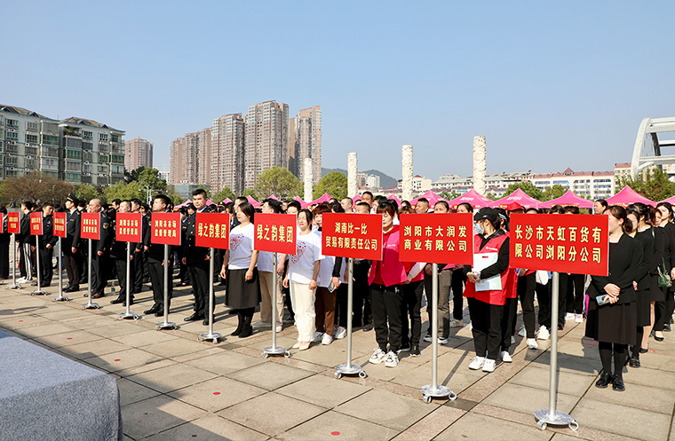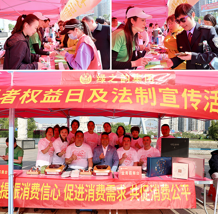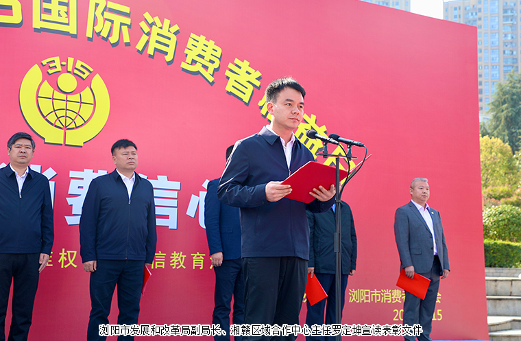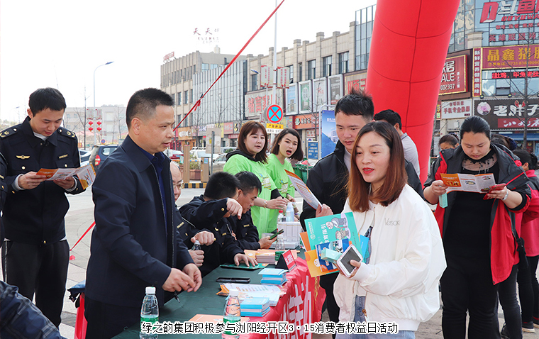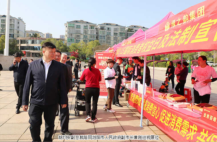 2023年3月15日,瀏陽市3·15國際消費者權(quán)益日活動在瀏陽河廣場舉行?;顒右浴疤嵴裣M信心”為主題。瀏陽市人民政府副市長黃剛,瀏陽市市委宣傳部副部長、文明辦主任李林,瀏陽市政府辦公室副主任李升穩(wěn),瀏陽市市場監(jiān)督管理局黨組書記、局長、瀏陽市消費者委員會會長孫玉樟,瀏陽市發(fā)展和改革局副局長、湘贛區(qū)域合作中心主任羅定坤等領導參加活動。綠之韻集團副總裁胡均安帶領部分員工和經(jīng)銷商代表參加活動。