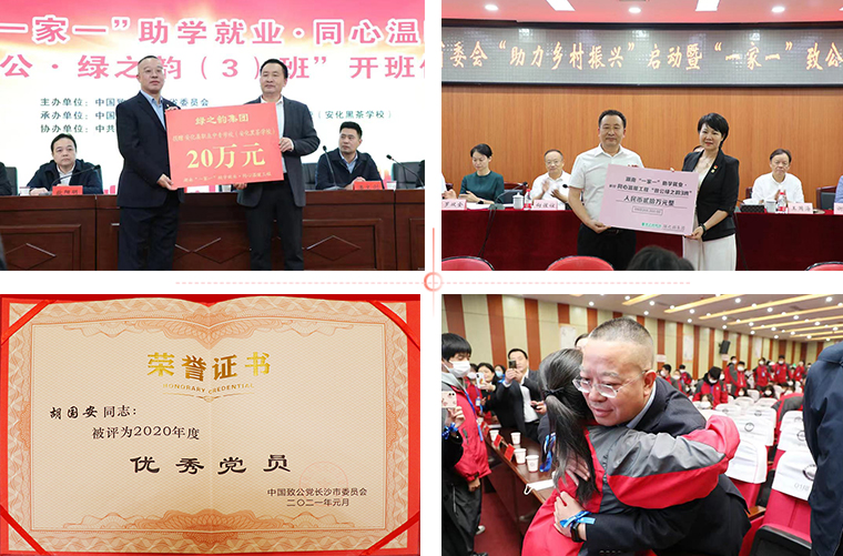 胡國安董事長表示,致力為公,是每一個致公黨員心中永遠不變的目標。作為湖南本土企業(yè),綠之韻集團始終把企業(yè)自身發(fā)展和國家經(jīng)濟社會發(fā)展緊密相結(jié)合,始終秉持“造福人類、回饋社會”的企業(yè)理念,踴躍參與多項社會公益事業(yè),積極響應(yīng)省委統(tǒng)戰(zhàn)部、致公黨省委、市委的號召,奮力投身“一家一”助學(xué)就業(yè)·同心溫暖工程、助力扶貧攻堅、鄉(xiāng)村振興工程。自2012年以來,先后捐資建設(shè)“致公·綠之韻班”“致公·綠韻生態(tài)班”“致公·綠之韻3班”,給予品學(xué)兼優(yōu)的困難學(xué)生更多學(xué)習(xí)機會,致力于為鄉(xiāng)村振興儲備更多優(yōu)質(zhì)人才;充分參與致公黨湖南省委會“致安”合作計劃,向致公黨湖南省委會在安化打造胡家村、高馬二溪村、神灣村和芙蓉村四個“同心致富村”捐贈愛心款項。先后被中國致公黨中央委員會評為“脫貧攻堅先進個人”,被致公黨湖南省委員會授予“全省抗擊新冠肺炎疫情先進個人”榮譽稱號,被致公黨長沙市委員會授予“優(yōu)秀黨員”及“防疫抗疫先鋒”榮譽稱號,并入選致公黨長沙市委會“四十年四十人”榮譽名錄。作為一名致公黨員,他將繼續(xù)牢記自己的身份和使命,在致公黨湖南省委的正確領(lǐng)導(dǎo)下,緊緊圍繞“僑海報國、參政議政、致公助學(xué)、鄉(xiāng)村振興”等工作主題,一絲不茍,爭做奉獻。在今后的工作中與廣大致公黨員、企業(yè)家一起,不斷提高自身素質(zhì),認真履行各項職責,再接再厲,不懈前行,努力為長沙各項事業(yè)的全面發(fā)展貢獻力量!