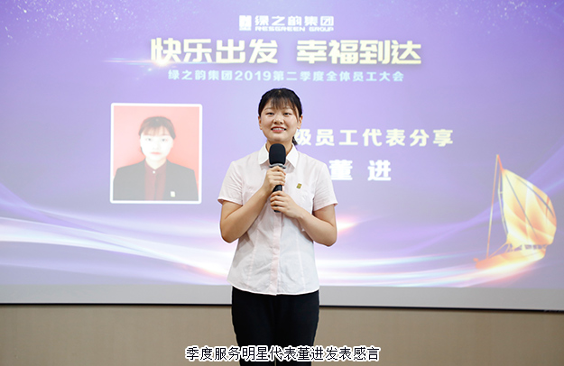 隨后,綠之韻集團(tuán)董事、總裁勞嘉講話。她首先對(duì)二季度獲得優(yōu)秀稱號(hào)的集體與個(gè)人表示了祝賀。她在講話中表示,十六歲的綠之韻還是一家年輕的企業(yè),在成長(zhǎng)過(guò)程中有曲折與困難,但對(duì)未來(lái),更多的是期許、夢(mèng)想和無(wú)限可能。2019年上半年,每一個(gè)綠之韻人都能以積極陽(yáng)光的心態(tài)去迎接每一份挑戰(zhàn),戰(zhàn)勝每一個(gè)困難,感謝每一位家人的付出。人才,是一家企業(yè)基業(yè)長(zhǎng)青、持續(xù)發(fā)展的關(guān)鍵因素,為更好地迎接下半年工作,公司正在開展年中系列專題培訓(xùn),希望每一位家人有所學(xué)、有所悟,從培訓(xùn)中、從學(xué)習(xí)中、從與領(lǐng)導(dǎo)同事的交流中,去開悟、去思考,獲得成長(zhǎng),成為更好的自己。不忘初心,奮進(jìn)未來(lái),“綠之韻”這三個(gè)字是我們所有人的初心,希望所有員工在下半年的工作中能繼續(xù)堅(jiān)守崗位、同心協(xié)力、共同進(jìn)步,再創(chuàng)佳績(jī)。我們都是追夢(mèng)人,一起奔跑在追尋幸福的路上!