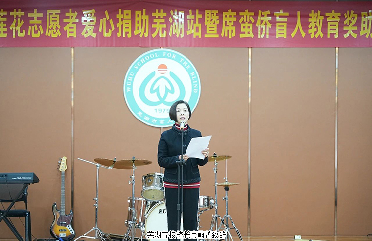 校長席蔚菁先后榮獲蕪湖市“優(yōu)秀園丁”、“優(yōu)秀校長”,安徽省“優(yōu)秀民辦學(xué)校校長”光榮稱號。在活動開始為大家講述了盲校的由來和初心,讓我們更能深入了解,幫困助學(xué)。