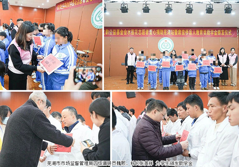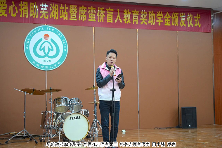 綠之韻水蓮花公益專項(xiàng)基金愛心捐助2023年度蕪湖盲校席蠻僑盲人教育助學(xué)金共30000元,以及10000元樂器和5000元的零食禮包。