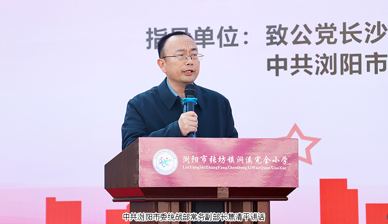 中共瀏陽市委統(tǒng)戰(zhàn)部常務副部長焦清平講話。“同心護花開·一起向未來”主題活動是瀏陽統(tǒng)一戰(zhàn)線2023年助力鄉(xiāng)村振興,開展社會服務的重要舉措之一。今天的活動既有資助項目,又有實踐基地,這種形式為學校長遠的發(fā)展和孩子健康成長的計劃做得更加有聲有色,有形有象。未成年人的健康成長需要全社會的關注,我們希望通過這個平臺可以引領更多的愛心人士,更多的黨員企業(yè)來關注,將這些力量聚的更強,將平臺打造成為更有影響力更大的工作品牌。我們要以此次活動為契機,進一步把行動聚焦落實到參政議政,民主監(jiān)督,把力量凝聚到服務經濟社會發(fā)展,講好中國故事,講好瀏陽故事上,在瀏陽高質量發(fā)展的新征程中,彰顯致公的更大擔當,貢獻更大的致公力量。