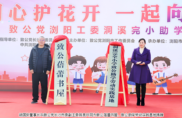 據(jù)了解,此致公助學活動,綠之韻公益基金會通過湖南省致公助學通道向洞溪完小捐贈20萬元愛心款項,用于對困難學生的資助,并建設一個蓓蕾書屋,打造一個致公助學勞動實踐基地?;顒蝇F(xiàn)場,胡國安董事長與致公黨長沙市委副主委陳旻共同為致公蓓蕾書屋、致公助學勞動實踐基地揭牌。