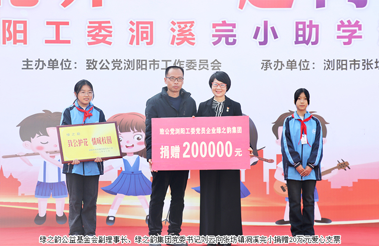 同心赴花開,一起向未來。儀式上,胡國安董事長表示,每次來到學校開展公益活動都會回想起自己的過去。幾十年前,他與在座各位一樣出生在一個普普通通的小山村,靠著讀書勇敢地走出了大山。趕上改革開放的春風,他創(chuàng)辦了綠之韻這家企業(yè)。“企業(yè)小的時候是自己的,做到一定大的時候就是國家的、是社會的?!本G之韻集團董事長胡國安在接受媒體采訪時這樣說道。20年前,綠之韻集團在瀏陽這片紅色沃土扎根,在瀏陽各級領導的關心和支持下,秉持著“關愛生命 造福人類”的發(fā)展理念,在發(fā)展實業(yè)的同時,積極承擔社會責任,產業(yè)富民,回饋社會。陸續(xù)開展了希望學校、愛心圖書館、關愛困難母親、綠+兒童關愛、鄉(xiāng)村振興等100多項公益項目,累計捐贈款物8200多萬元。他表示,少年強則國強,青少年是祖國的希望與未來。教育幫扶一直是綠之韻公益基金會的重要關注點之一。今天,在張坊鎮(zhèn)洞溪完小開展“致公助學”活動捐贈20萬元愛心款項,是用于致公蓓蕾書屋和致公助學勞動實踐基地的建設,為改善學校教學環(huán)境和條件提供力所能及的幫助,營造濃厚的關心教育和培養(yǎng)人才的濃厚氛圍。未來,綠之韻將繼續(xù)關注青少年的成長,影響和帶動更多的愛心企業(yè)及人士關注教育事業(yè),參與到“致公助學”的行動中來,讓更多的孩子都能夠在關愛和溫暖中健康成長,為繪就中國式現(xiàn)代化的瀏陽圖景貢獻一份力量。