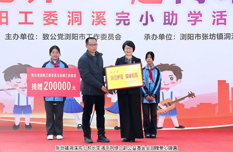 活動伊始,中共瀏陽市張坊鎮(zhèn)黨委副書記、鎮(zhèn)長石盼在致辭中感謝了致公黨長沙市委、瀏陽市委以及愛心企業(yè)綠之韻對學校及孩子們的關愛與幫助。致公黨瀏陽工委主委、科技局局長鄧恩介紹助學情況。隨后,綠之韻公益基金會副理事長、綠之韻集團黨委書記劉云上臺向張坊鎮(zhèn)洞溪完小捐贈20萬元愛心支票。張坊鎮(zhèn)洞溪完小校長李海平向綠之韻公益基金會回贈愛心牌匾。