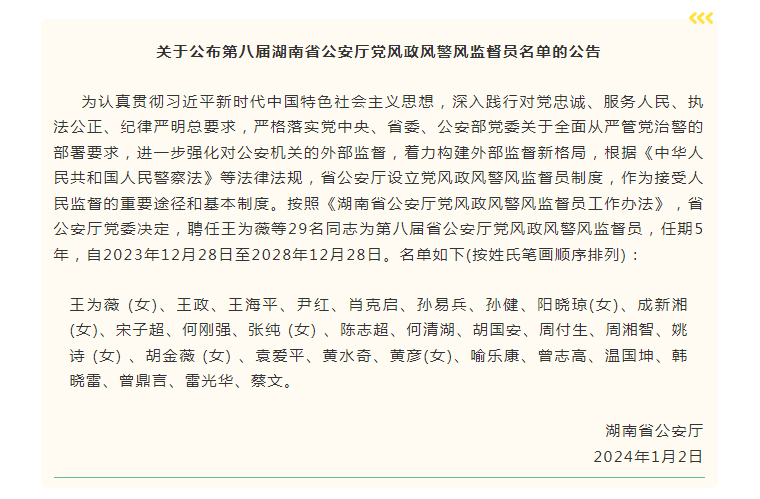 2024年1月2日,湖南省公安廳召開(kāi)第八屆黨風(fēng)政風(fēng)警風(fēng)監(jiān)督員聘任會(huì)議。旨在深入貫徹黨中央和省委、公安部全面從嚴(yán)管黨治警決策部署,全面總結(jié)第七屆省公安廳特邀監(jiān)督員工作,部署推進(jìn)第八屆省公安廳黨風(fēng)政風(fēng)警風(fēng)監(jiān)督員工作,全面加強(qiáng)外部監(jiān)督,助推全省公安工作現(xiàn)代化。公安部監(jiān)督員、湖南省人民醫(yī)院常務(wù)副院長(zhǎng)向華,湖南省公安廳黨委副書(shū)記、常務(wù)副廳長(zhǎng)周賽保,湖南省紀(jì)委駐公安廳紀(jì)檢監(jiān)察組組長(zhǎng)、湖南省公安廳黨委委員段國(guó)華出席會(huì)議,周賽保為監(jiān)督員頒發(fā)聘書(shū)并講話。湖南省公安廳黨委委員、政治部主任余良勇主持會(huì)議。湖南省公安廳交警總隊(duì)總隊(duì)長(zhǎng)、一級(jí)警務(wù)專(zhuān)員蔣建湘,經(jīng)偵總隊(duì)總隊(duì)長(zhǎng)、一級(jí)警務(wù)專(zhuān)員石敏初,特勤局政委栗民軒,湖南省紀(jì)委駐公安廳紀(jì)檢監(jiān)察組副組長(zhǎng)宋紅兵,長(zhǎng)沙鐵路公安處處長(zhǎng)董延?xùn)|,刑偵總隊(duì)總隊(duì)長(zhǎng)敖平洋,網(wǎng)技總隊(duì)總隊(duì)長(zhǎng)雷衛(wèi)軍等參加會(huì)議。全國(guó)政協(xié)委員、湖南啟元律師事務(wù)所首席合伙人袁愛(ài)平,湖南省人大代表、中南大學(xué)湘雅醫(yī)院院長(zhǎng)雷光華,長(zhǎng)沙市人大代表、湖南省海外聯(lián)誼會(huì)副會(huì)長(zhǎng)、綠之韻集團(tuán)董事長(zhǎng)胡國(guó)安等受邀參加會(huì)議,并受聘為第八屆湖南省公安廳黨風(fēng)政風(fēng)警風(fēng)監(jiān)督員。
