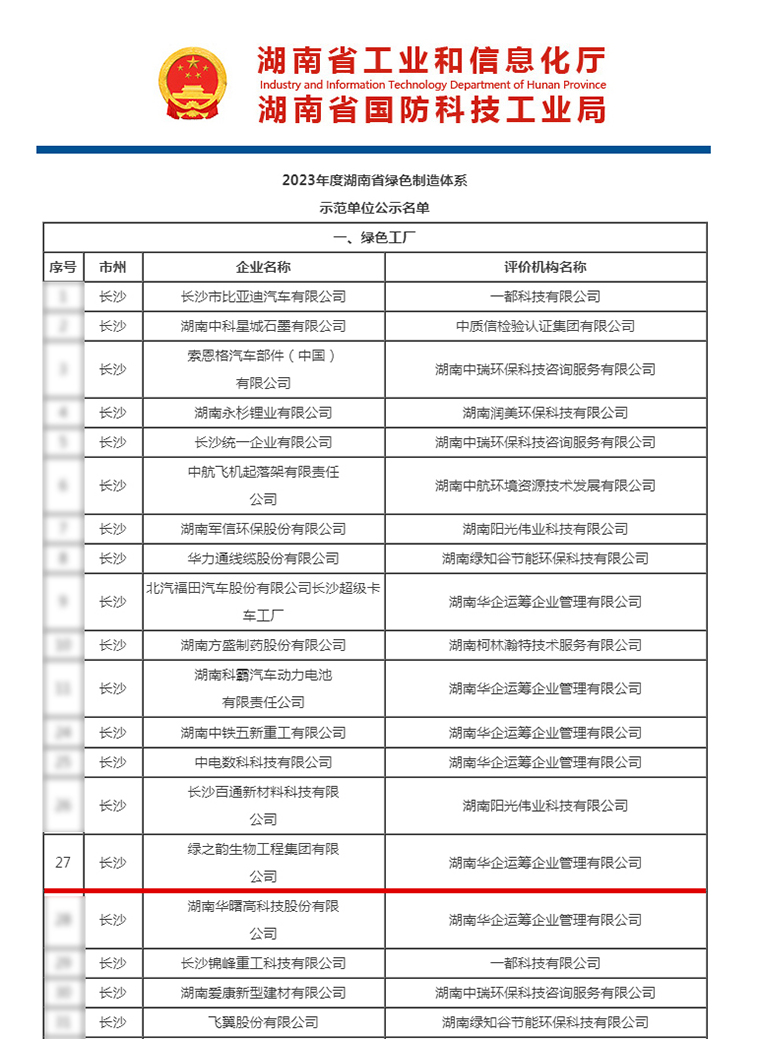 為全面落實(shí)《湖南省工業(yè)綠色“十四五”發(fā)展規(guī)劃》,持續(xù)完善綠色制造體系,加快推進(jìn)工業(yè)綠色低碳轉(zhuǎn)型和高質(zhì)量發(fā)展,湖南省工業(yè)和信息化廳發(fā)布了2023年度湖南省綠色制造體系示范單位公示,綠之韻集團(tuán)榮獲湖南省“綠色工廠”榮譽(yù)稱號(hào)。