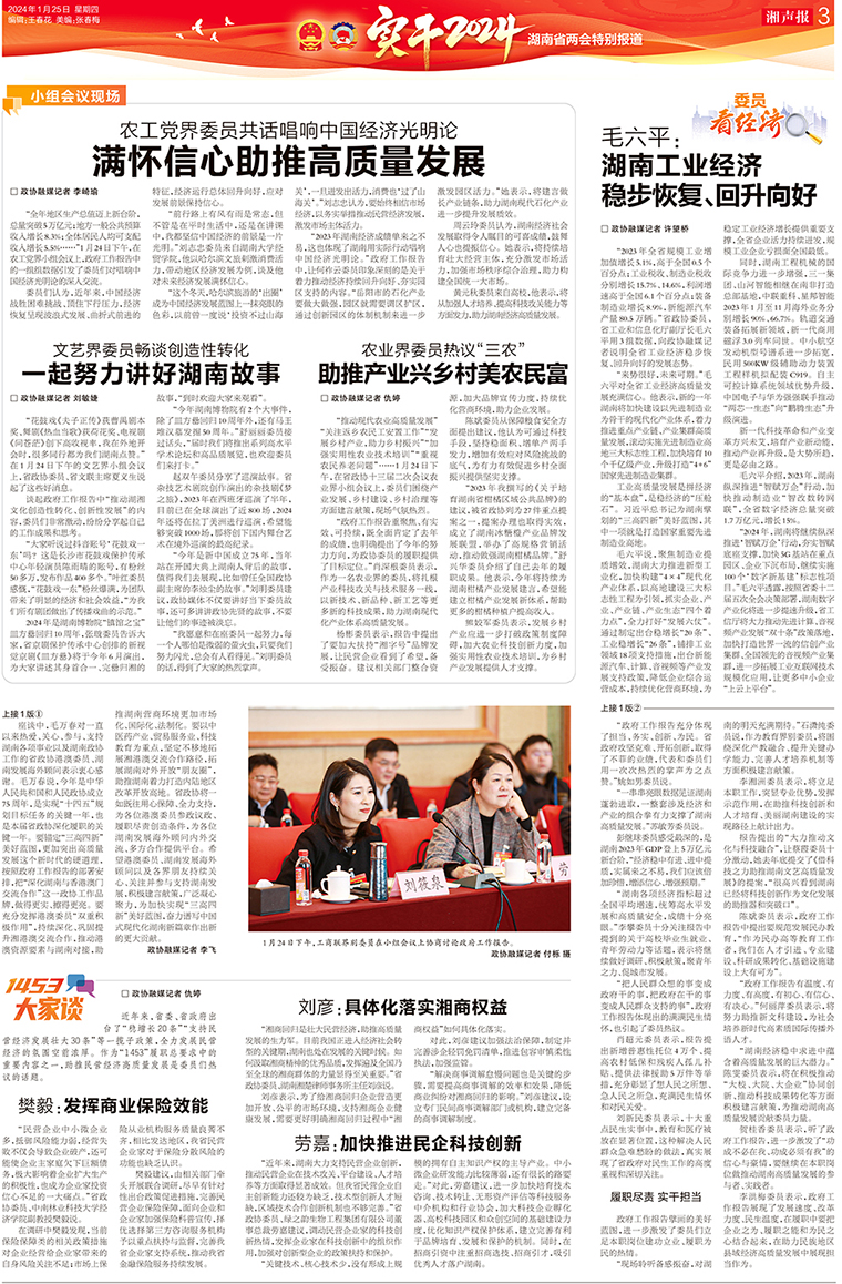 號角激越,催人奮進。勞嘉委員認為,報告總結(jié)的成績鼓舞人心,所描繪的藍圖催人奮進,政協(xié)工作確實落在了“協(xié)”,干在了“實”,有方向、有重點、有合力、有激情、有章法、有實效。尤其是十三屆常委會制定的“1453”履職總要求,讓委員們學(xué)會緊扣“國之大者”“省之大計”“民之關(guān)切”切實履職。作為一名扎根湖南二十年的企業(yè)家,特別對報告中提出的2024年要“在助推民營經(jīng)濟高質(zhì)量發(fā)展上彰顯新作為,圍繞優(yōu)化法治化營商環(huán)境、促進民營經(jīng)濟發(fā)展政策落實情況開展民主監(jiān)督,助推惠企政策落實落地”“在深化湘港澳交流合作上邁出新步伐,促進湘港澳中醫(yī)藥產(chǎn)業(yè)優(yōu)勢互補、協(xié)同發(fā)展,促進服務(wù)貿(mào)易、科技教育等領(lǐng)域交流合作,助推湖南全面融入粵港澳大灣區(qū)國家戰(zhàn)略”等工作部署,充滿期待,時刻準備。在接下來的工作中,將懷著高度的使命感和強烈的責任感,充分發(fā)揮好政協(xié)委員的示范引領(lǐng)作用,做實本職實體,加快創(chuàng)新升級,為實現(xiàn)“三高四新”美好藍圖、建設(shè)社會主義現(xiàn)代化新湖南貢獻智慧和力量。