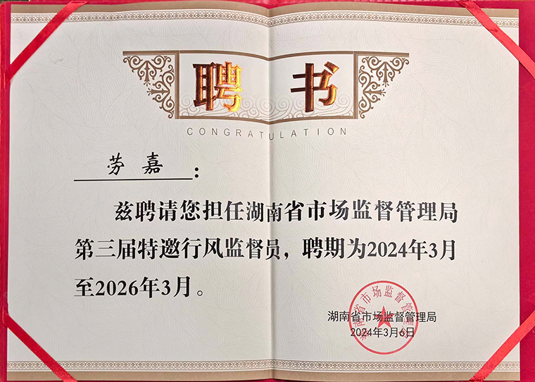 在湖南省市場監(jiān)督管理局聘請第三屆特邀行風(fēng)監(jiān)督員會議上,湖南省市場監(jiān)督管理局一級巡視員歐陽黎明宣讀聘任通知。勞嘉總裁被續(xù)聘為湖南省市場監(jiān)督管理局第三屆特邀行風(fēng)監(jiān)督員。她表示,此次受聘為第三屆省市場監(jiān)督管理局特邀行風(fēng)監(jiān)督員,深感使命光榮、責(zé)任重大。未來,將繼續(xù)認(rèn)真履行好市場監(jiān)管系統(tǒng)行風(fēng)建設(shè)的監(jiān)督職責(zé),發(fā)揮好行風(fēng)監(jiān)督作用、橋梁紐帶作用和參謀智囊作用,為促進(jìn)我省市場經(jīng)濟(jì)的高質(zhì)量發(fā)展作出積極貢獻(xiàn)。