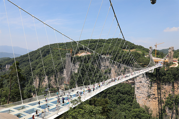 張家界大峽谷玻璃橋又名“云天渡”,有著"天橋合一,以渡天下之人"的美譽(yù),是一座全透明玻璃景觀橋梁,兼具景區(qū)行人通行、游覽、蹦極、溜索、T臺等功能,也是世界最高最長的斜拉式高山峽谷玻璃橋。在云霧之間,大橋宛如千尺白綾在其中若隱若現(xiàn),一踏上橋面便從山水之中突然超脫出山水之外。綠之韻家人們漫步在玻璃橋,輕吻藍(lán)天白云,渡過峽谷從橋這頭走到那頭,仿佛也將家人們的心渡得更加接近。