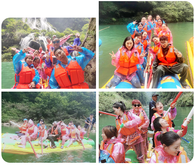 “張家界看山,猛洞河玩水。”在猛洞河,綠之韻家人們乘坐著小筏,從“哈妮宮”出發(fā),順?biāo)拢蝗~扁舟,在原始次生林的高山峽谷之中,身著救身衣、乘皮舟、闖險灘、博激流、沿途觀美景、沐瀑流、打水仗、過峽關(guān),出沒浪端谷底,途經(jīng)三角巖、雞籠門、捏土瀑布、閻王灘、落水坑瀑布、夢思峽等數(shù)十個景點(diǎn),兩岸秀麗的風(fēng)光無不令人叫絕觀止。家人們在漂流途中放歌長嘯,或搏浪闖灘,或戲水嬉鬧,找回快樂童真的自我。