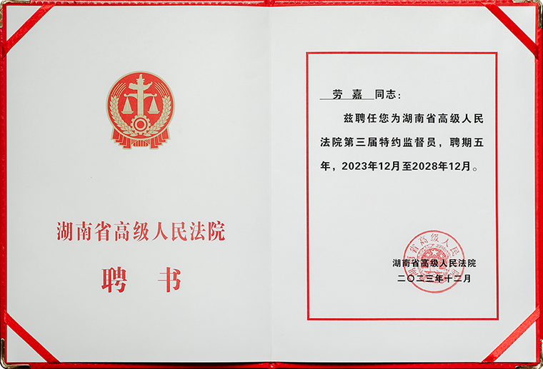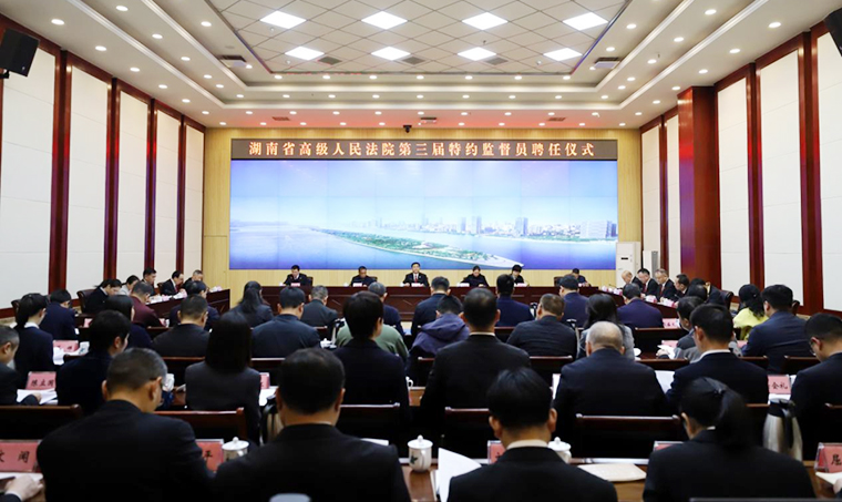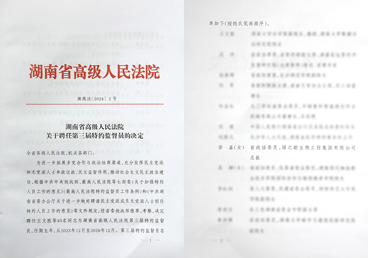 2024年3月21日,湖南省高級人民法院舉行第三屆特約監(jiān)督員聘任儀式。湖南省高級人民法院黨組書記、院長朱玉出席會議并講話,為特約監(jiān)督員代表頒發(fā)聘書。湖南省高級人民法院黨組副書記、副院長鄔文生主持會議。中共湖南省委統(tǒng)戰(zhàn)部副部長廖建華出席會議并講話。中共湖南省委政法委二級巡視員羅壽初,省人大監(jiān)察和司法委員會副主任委員段成鋼,省政協(xié)社會和法制委員會駐會副主任楊天兵出席會議。湖南省高級人民法院黨組成員、政治部主任李知文宣讀聘任決定。湖南省政協(xié)委員、綠之韻集團總裁勞嘉等40名同志被聘為湖南省高級人民法院第三屆特約監(jiān)督員。