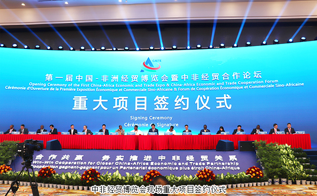 開幕式后,此次博覽會還舉行了重大項目簽約儀式,現(xiàn)場簽署項目13個,涉及8個非洲國家,總金額超過25億美元。