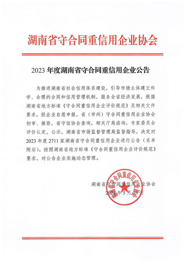 近日,湖南省守合同重信用企業(yè)協(xié)會、長沙市守合同重信用企業(yè)協(xié)會分別發(fā)布了《2023年度湖南省守合同重信用企業(yè)公告》《2023年度長沙市守合同重信用企業(yè)公告》。綠之韻集團憑借完善的企業(yè)誠信建設體系與科學的企業(yè)管理水平連續(xù)第16次榮登榜單,被授予“湖南省守合同重信用企業(yè)”“長沙市守合同重信用企業(yè)”榮譽稱號。