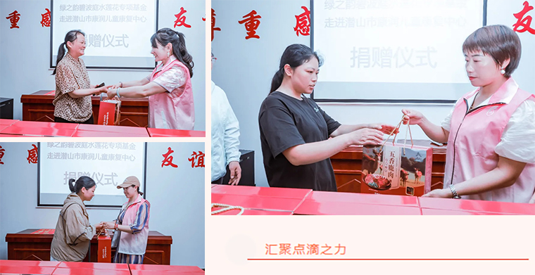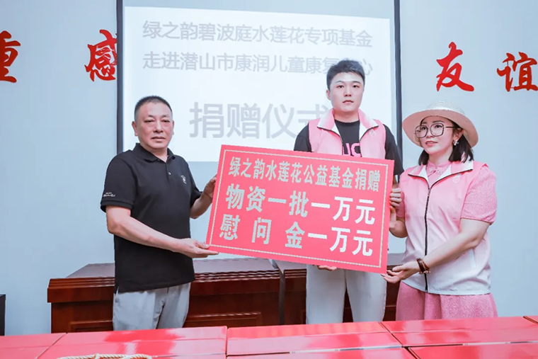 由綠之韻碧波庭傳承委朱浩齊葛慧霞伉儷代表綠之韻碧波庭水蓮花專項(xiàng)基金 ,向潛山市康潤(rùn)兒童康復(fù)中心捐贈(zèng)物資慰問(wèn)金共計(jì)2萬(wàn)元。