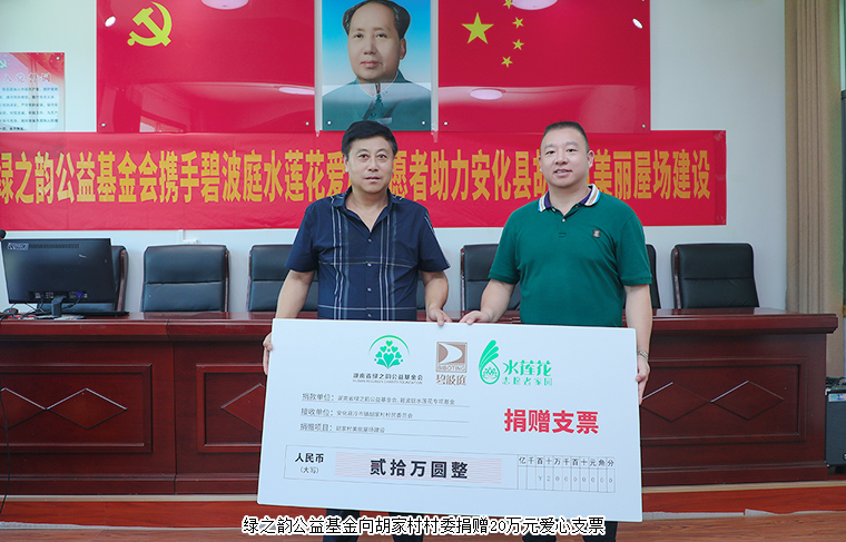 捐贈(zèng)儀式上,綠之韻集團(tuán)常務(wù)副總裁胡均安代表綠之韻公益基金會(huì)向胡家村村委捐贈(zèng)20萬(wàn)元愛(ài)心支票,安化縣人大常委會(huì)副主任李艷云回贈(zèng)愛(ài)心牌匾。“共建屋場(chǎng)獻(xiàn)愛(ài)心,情系鄉(xiāng)村賦真情”,是胡家村全體村民對(duì)綠之韻愛(ài)心義舉的誠(chéng)摯感謝。
