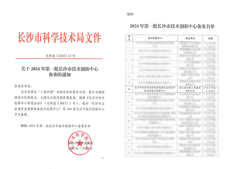近日,根據(jù)《長沙市技術創(chuàng)新中心管理辦法》(長科發(fā)〔2023〕5號),經(jīng)宣傳發(fā)動、自愿申報、推薦部門推薦、專家評審、長沙市科學技術局黨組會研究、長沙市人民政府審定等程序,長沙市科學技術局對“2024年第一批長沙市技術創(chuàng)新中心”備案,綠之韻集團建設的“長沙市藥食兩用資源高效提取及綜合開發(fā)利用技術創(chuàng)新中心”成功入選。此次入選,是長沙市科學技術局對綠之韻集團的科技創(chuàng)新能力、研發(fā)團隊建設等方面的權威認可。