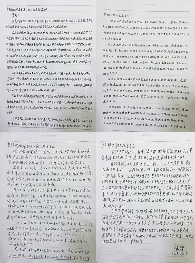 捐贈(zèng)儀式上,肖校長(zhǎng)致歡迎辭,他首先對(duì)參加本次捐贈(zèng)儀式的領(lǐng)導(dǎo)和嘉賓表示熱烈歡迎,對(duì)善舉致以誠(chéng)摯的謝意,匯報(bào)了長(zhǎng)郡瀏陽(yáng)實(shí)驗(yàn)學(xué)校的辦學(xué)理念、管理制度以及取得的成績(jī)。他表示,長(zhǎng)郡瀏陽(yáng)實(shí)驗(yàn)學(xué)校是經(jīng)瀏陽(yáng)市人民政府批準(zhǔn)與長(zhǎng)郡中學(xué)合作辦學(xué)的一所12年一貫制公辦學(xué)校,在瀏陽(yáng)市政府支持下、在長(zhǎng)郡中學(xué)的委托管理和引領(lǐng)下取得了比較好的成績(jī),成為瀏陽(yáng)市辦學(xué)的成功典范,也成為瀏陽(yáng)教育對(duì)外展示的窗口。感謝園區(qū)領(lǐng)導(dǎo)、園區(qū)企業(yè)的大力支持,才有了今天的成績(jī)。此次愛(ài)心捐贈(zèng),為學(xué)校解決了后顧之憂(yōu),為學(xué)校的困難學(xué)生、優(yōu)秀學(xué)生帶來(lái)新的希望,為教育注入溫暖力量。學(xué)生們滿(mǎn)懷感激之情,自發(fā)手寫(xiě)了多封感謝信,感謝綠之韻集團(tuán)為學(xué)校捐資助教,對(duì)學(xué)子們的大力支持。未來(lái),希望能加強(qiáng)校企聯(lián)合,學(xué)校將推動(dòng)校企資源的深度融合,為企業(yè)輸送更多優(yōu)質(zhì)人才儲(chǔ)備力量,打造更優(yōu)質(zhì)的辦學(xué)典范,為瀏陽(yáng)教育發(fā)展貢獻(xiàn)力量。