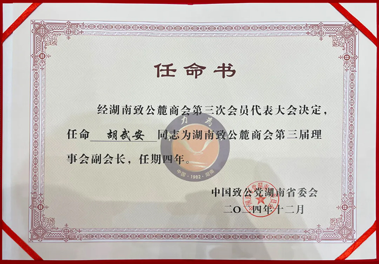 此次當(dāng)選為湖南致公麓商會(huì)副會(huì)長(zhǎng),胡武安副總經(jīng)理表示:這不僅是一種光榮,更是一份沉甸甸的責(zé)任。未來(lái),他將秉持“致力為公、僑海報(bào)國(guó)”的宗旨,發(fā)揮自身優(yōu)勢(shì),盡職盡責(zé),將自身及企業(yè)的發(fā)展同國(guó)家發(fā)展、經(jīng)濟(jì)社會(huì)發(fā)展緊密結(jié)合,在致公黨湖南省委會(huì)的領(lǐng)導(dǎo)下、在新一屆理事會(huì)的帶領(lǐng)下、與各位優(yōu)秀的民營(yíng)企業(yè)家們一道,發(fā)揮好橋梁紐帶作用,為商會(huì)的發(fā)展出謀劃策,為會(huì)員企業(yè)提供更好的服務(wù);積極帶領(lǐng)企業(yè)履行社會(huì)責(zé)任,進(jìn)一步凝聚致公力量,立足新起點(diǎn),實(shí)現(xiàn)新發(fā)展,再創(chuàng)新輝煌。